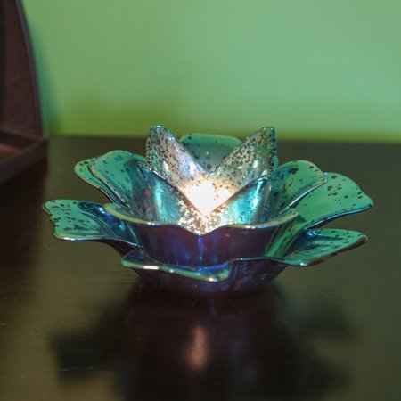 Home-X Blue Lotus Glass Votive Holder Let the spiritual qualities of the lotus flower create a meditative mood. This beautiful votive holder is handcrafted from art glass in a luminous hue of blue with clear, free-form speckles lending a mesmerizing touch. Add your votive candle and watch as the three layers of petals radiate with color and light. Enchanting in a bathroom, bedroom or wherever you seek solitude and peace. And it̢۪s a lovely addition to yoga practice or meditation. Votive not included. About 3' high by 7' in diameter.